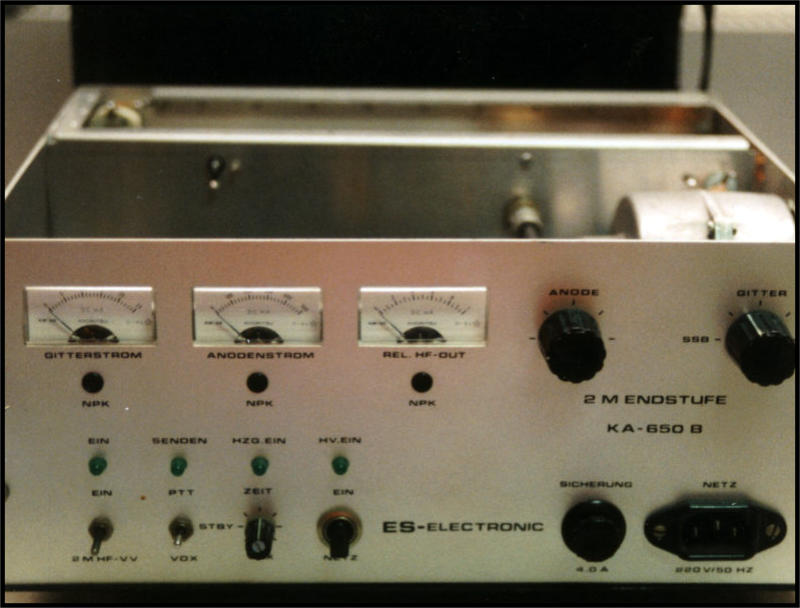 Fertigstellung: 1990 Input: 10 WattOutput: 400 WattAnodenspannung: 2.100VBeschreibung:Mittlere Abb. Gitterkreis.Untere Abb. Anodenkreis.Trotz hoher Leistung kleine Gesamtabmessungen.Bei Dauerstrichanwendungen ist die Ausgangsleistung zu reduzieren.Ein Tribut an die kleinen Abmessungen. Alles in Allem ein technisch und optisch ausgereiftes Produkt mit vielen Sicherheitsvorkehrungen zum Schutz der Röhre.Optisch und technisch eine gute Lösung.