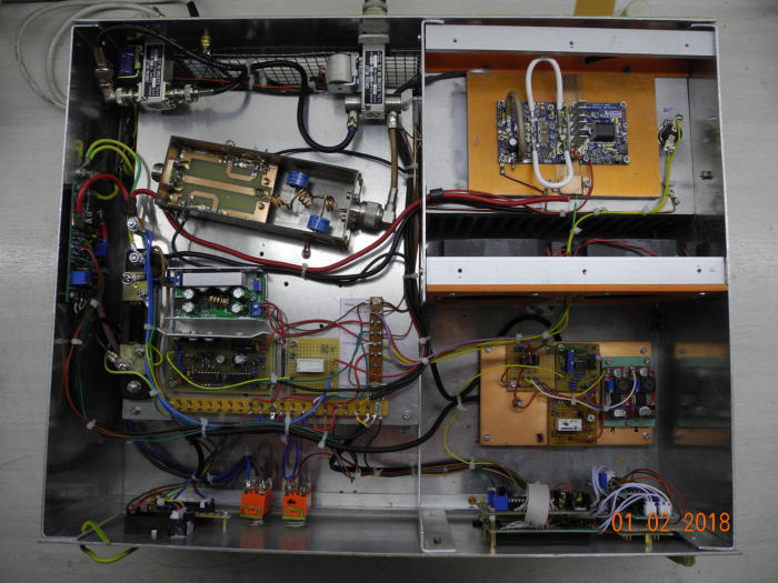 Fertigstellung: 2018Testdaten des Modules:Spannungsversorgung: 50VInput: 3,5WOutput: 800WWirkungsgrad: ca. 70%Beschreibung:Ziel dieses Projektes war es, eine mechanischund elektrisch robuste PA zu bauen.Alles sollte in einem Gehäuse und fürFieldday-Betrieb praktikabel sein.Da kein passendes Gehäuse zu findenwar, kam ein 19“-Rack Case mit 3 HE zumEinsatz.Leider erwies sich der Bau desEinschubchassis als sehr aufwändig.Als LD-MOS kam ein BLF578 zurVerwendung, da er noch in meiner Reservekiste schlummerte.Damit ist die brauchbare Ausgangsleistungauf 800W beschränkt.Der weitere Aufbau und Inbetriebnahmeerwiesen sich als problemlos.Die Module der weiteren Beschaltungentsprechen denen der vorangegangenenLS-MOS-PA mit 2 Modulen.Zusätzlich kam eine Temperaturanzeigezum Einsatz. Der Sensor sitzt direkt neben demCase des BLF.Alles Weitere dürfte aus den Bildern hervor gehen.